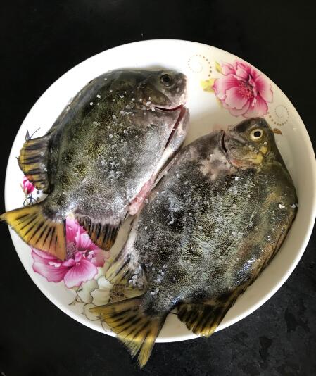 把金鼓鱼㓥好,金鼓鱼刺被刺到时会全身发冷,所以在处理的时候要很小心的。处理好的金鼓鱼放入盘子中,在鱼身上撤点盐,好入味。